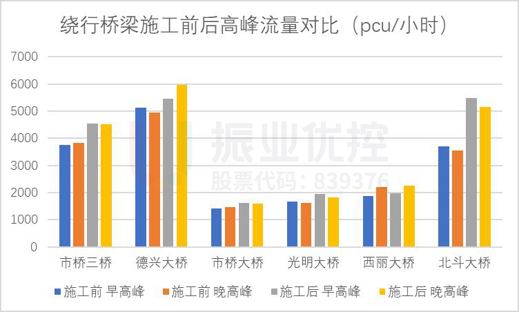 为更好地分析封桥影响情况,科学调整信号控制方案,对辖区通勤的其余6座桥梁进行施工前后车流量数据对比,数据如下所示: