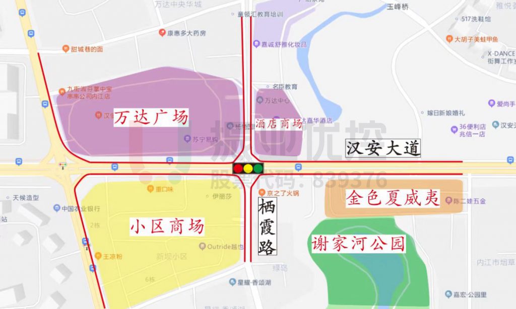 汉安大道与栖霞路交叉口(十字)位于内江市东兴区万达广场东南侧,由东西走向的汉安大道(双向8车道)以及南北走向的栖霞路(双向4车道)交叉组成。周边分布有万达广场、金色夏威夷、谢家河公园及其它居民小区、酒店、商场,是机动车、非机动车及行人过街主要汇聚点。