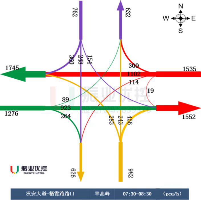 按汉安大道与栖霞路交叉口晚高峰东进口左转及直行流量情况来看,交叉口向东出口偏移出的单条左转车道,已不满足当前车流量通行需求;又因4条直行车道利用率不高,晚高峰车流汇聚较少,时常出现一条车道空放情况;同时结合东进口左转转弯半径和南出口现状,以及不同时段车流汇聚情况,东进口方向具备设置可变车道的条件。