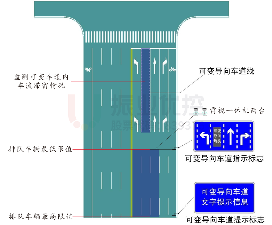 在可变信息牌位置,加装“雷视一体“设备,对可变车道、左转车道车辆实时监测,真正做到可变车道”实时可变“、依据实际车流”智能可变“。