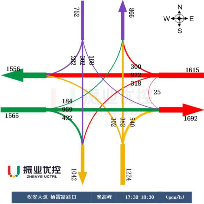 该交叉口早晚峰时段承载的交通压力较大,晚高峰时段东进口左转往南方向车辆汇聚拥堵现象尤为明显。