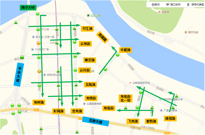 对五象总部基地片区、蟠龙片区内部道路实施区域化“绿波网”,五象总部基地路网平均车速提高12.6%,平均拥堵指数下降了7.4%,平均停车延误时间下降10.2%;蟠龙片区路网平均车速提高5.09%,平均拥堵指数下降2.92%,平均停车延误时间下降28.65%。