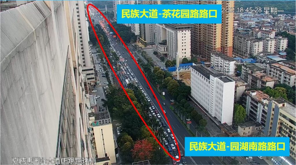 技术团队在充分挖掘现有道路的时空资源基础上,在安吉大道、民族大道等路段,创新应用“集装箱式”综合协调控制方案,利用绿波协调+红波截流的组合方式,有效解决饱和流量路段车流拥堵回溢问题。