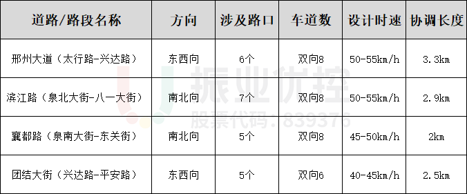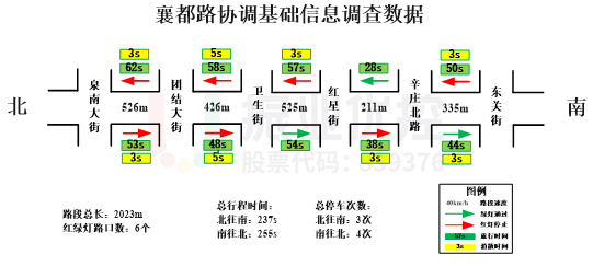 襄都路(泉南大街-东关街)以南北为基准,设计南北双向协调方案,设计速度为45km/h,双向均可一次性通过。