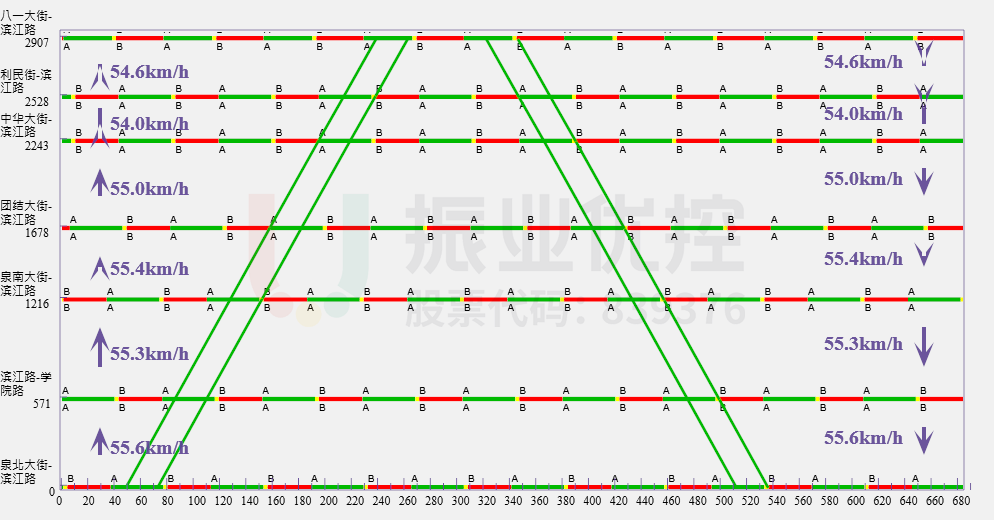 1.根据路段实际运行状况及信号机运行状态,对四条路段分别设计绿波方案,确定绿波速度。