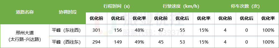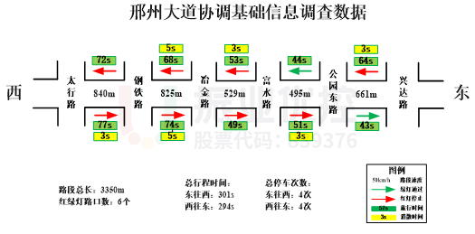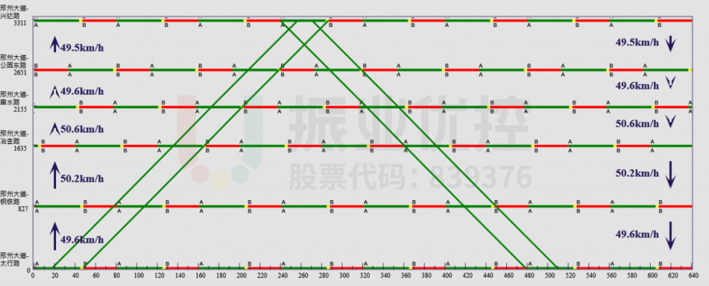 邢州大道(太行路-兴达路)以东西为基准,设计东西双向协调方案,设计速度为50km/h,双向均可一次性通过。