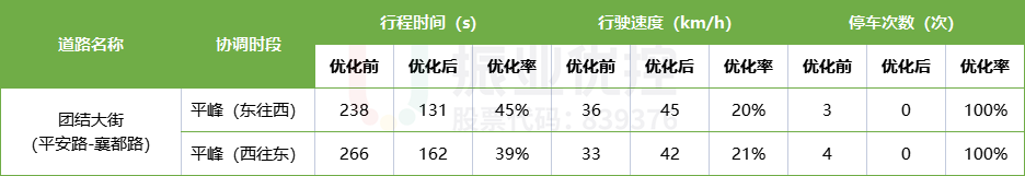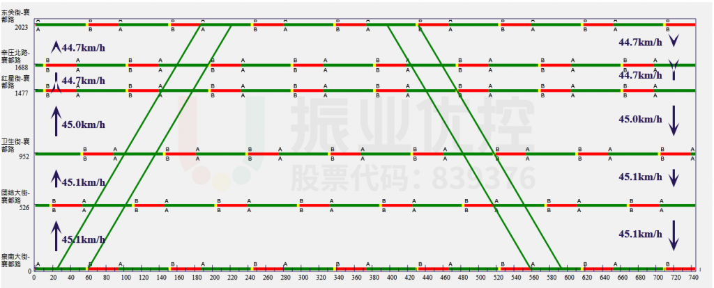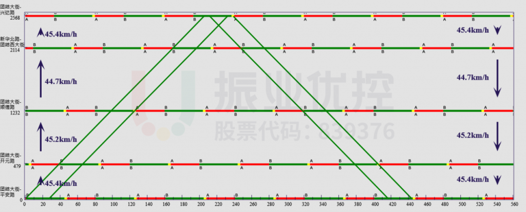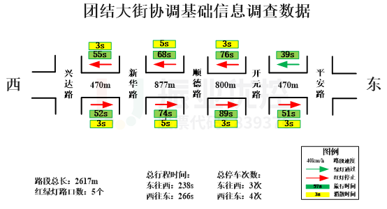 团结大街(平安路-兴达路)以东西为基准,设计东西双向协调方案,设计速度为45km/h,双向均可一次性通过。