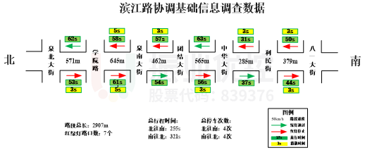 滨江路(泉北大街-八一大街)以南北为基准,设计南北双向协调方案,设计速度为55km/h,双向均可一次性通过。