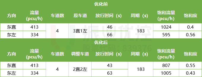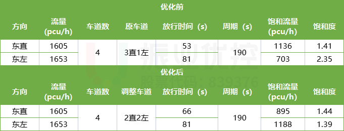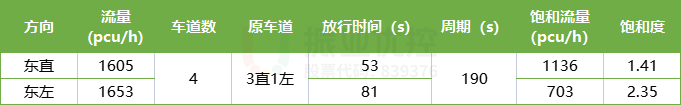 根据东进口出城方向早晚高峰流量分析,晚高峰时段出城车流较大,左转一条车道饱和度达到2.35。通过重新规划道路标线,东进口由原三直一左车道调整为两直两左车道,提高左转车辆通行效率。