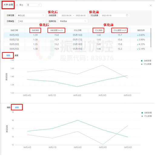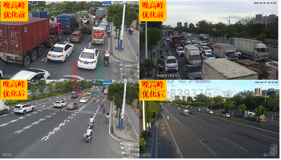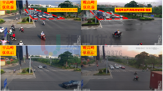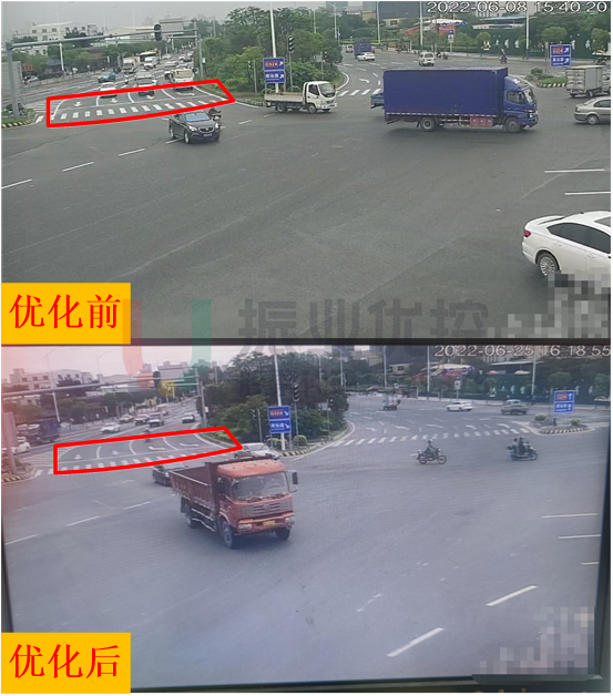 优化后,晚高峰东进口出城及早晚高峰金凤西路进城车辆的排队长度减少,左转车道饱和度下降40%,路口通行效率明显提升。路口早晚高峰时段整体拥堵指数下降4.01%,通行速度提升3%。