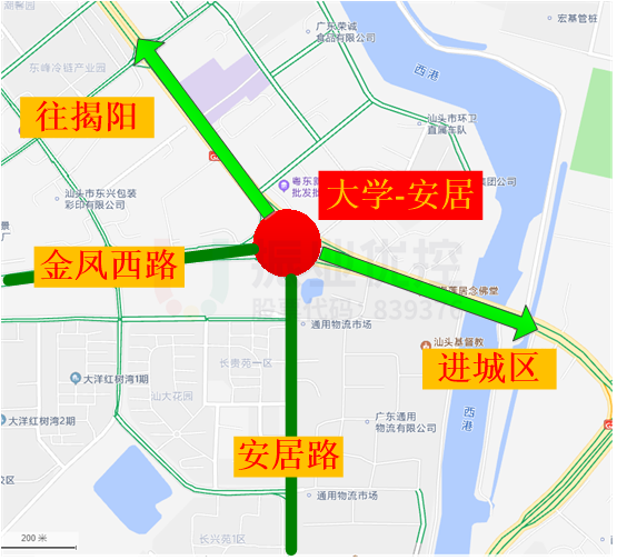 大学-安居路口位于汕头市金平区大学路与安居路交汇处,其中大学路为东西向主干道,西接揭阳市,东通往汕头城区,是进出市区的必经之路。