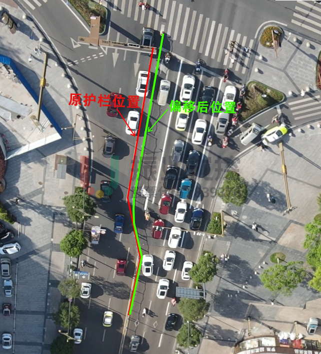原南出口道2条车道宽度分别为3.5米和2.3米,出口不畅。将中央隔离栏向进口道方向偏移50厘米,增大出口道宽度,便于尾车尽快通过路口。