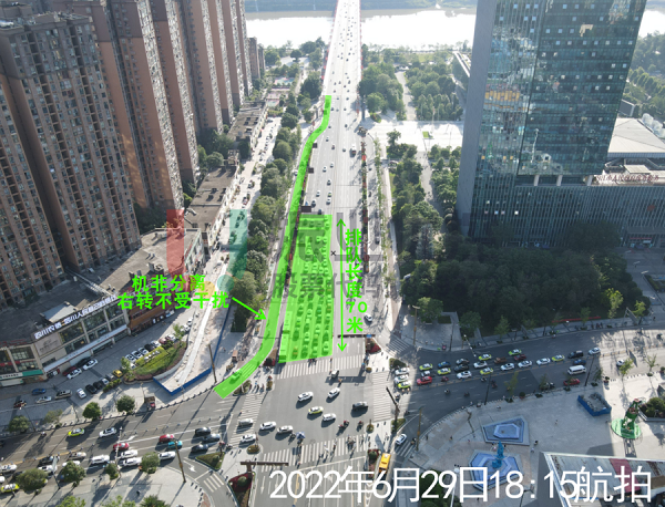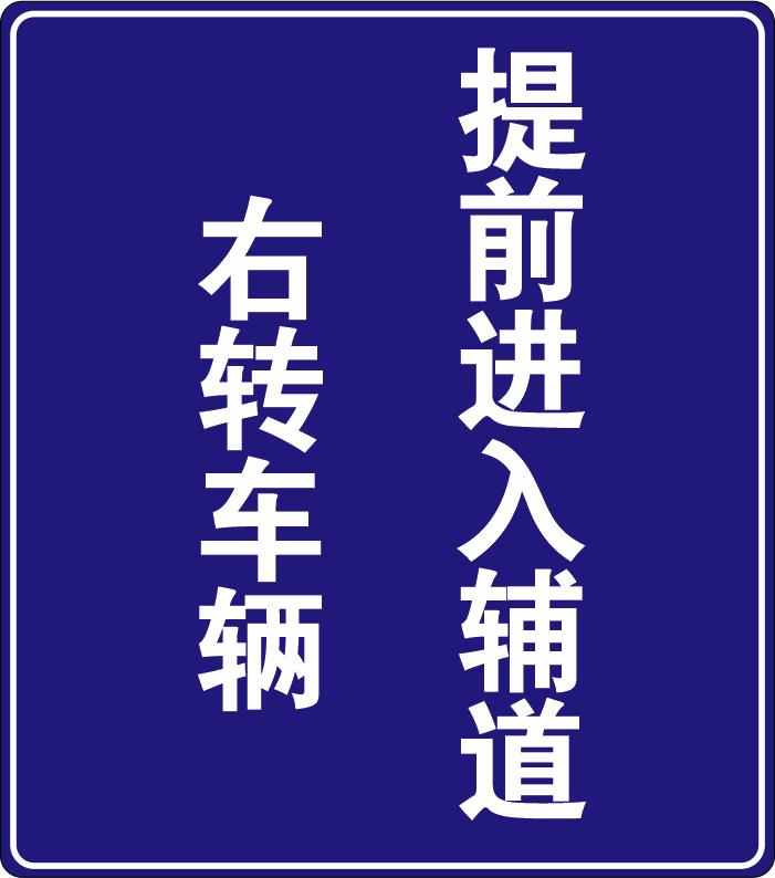 在西侧上游200米辅道入口处设置两三轮车专用道并设置右转专用车道,一是主道分离直行、右转车辆,二是辅道分离机动车与两三轮车。同时分别在新坝大桥、辅道入口两级设置诱导标志,提醒两三轮车与右转车辆靠右行驶提前进入辅道。