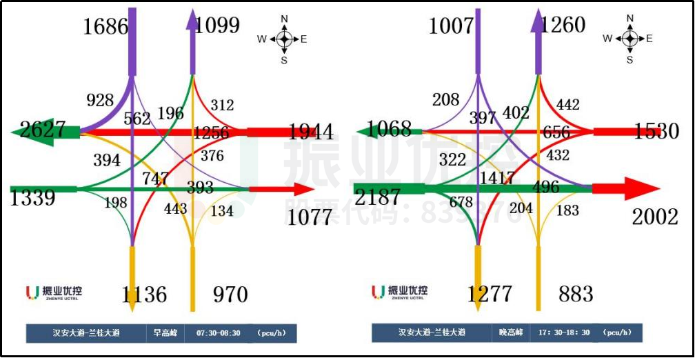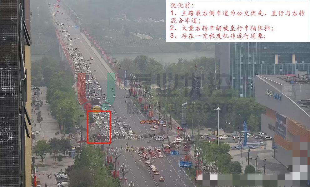 高峰时段东西向通行需求差异较大。该交叉口的配时、相位相序设置未考虑双向流量差异,粗放地设置东西双直相位,导致晚高峰期间出现西进口排长队、东进口却空放的现象。