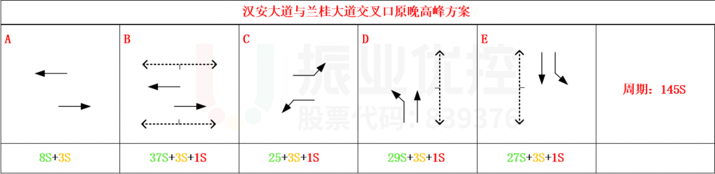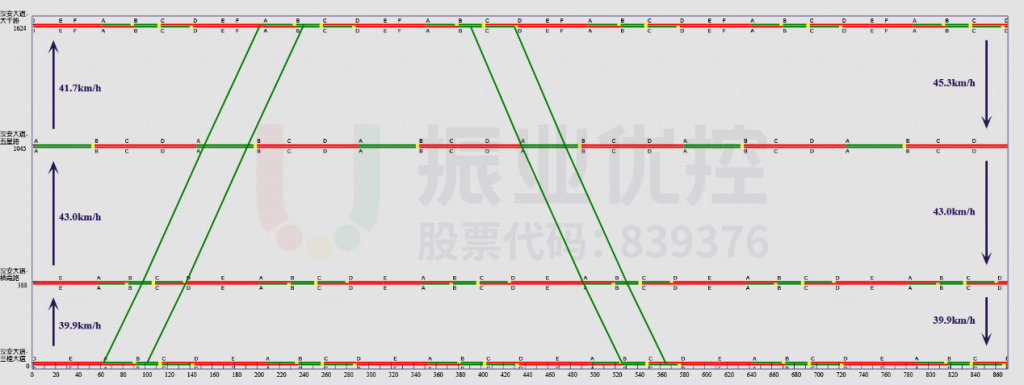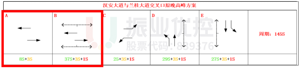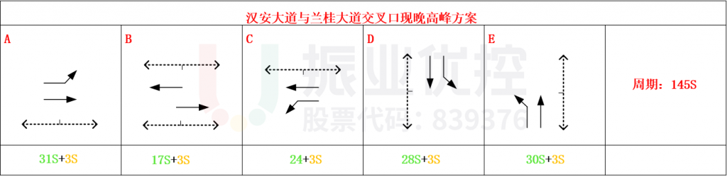 以汉安大道与兰桂大道交叉口作为关键路口,设计汉安大道与兰桂大道至汉安大道与大千路4个交叉口的双向绿波,根据实际流量流向特征,调整各交叉口相位相序,使车辆在协调路段上连续通过各个交叉口的时间最大化。