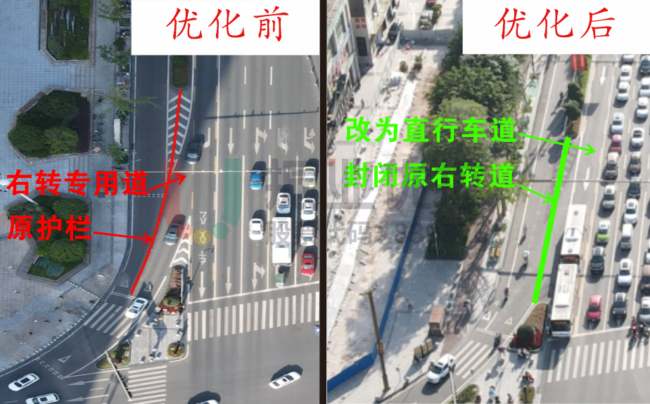 将西进口主路最右侧车道改为直行车道,采用隔离护栏封闭现有右转区,更改进口道标线。