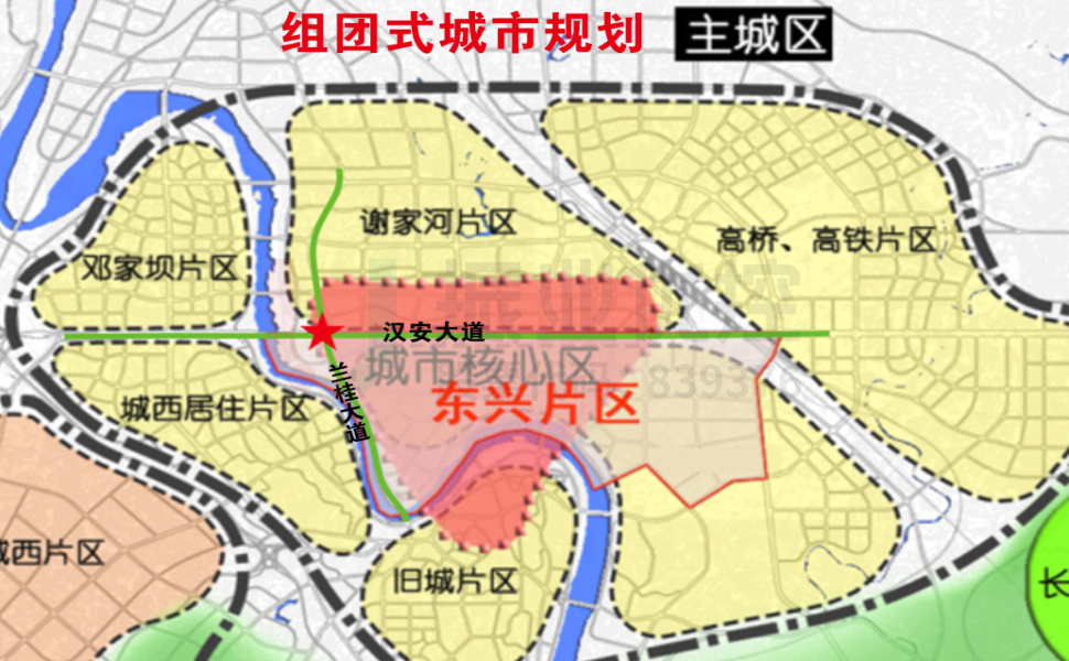 汉安大道与兰桂大道交叉口连接的东兴片区、谢家河片区、邓家坝片区、经开区、高新片区等各片区用地功能单一,导致职住分离片区间潮汐交通明显。