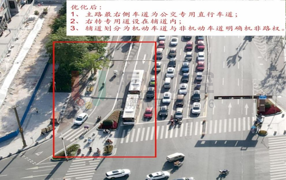 将西进口辅道设置为机动车与两三轮车右转通道,通过实线划分车道,再将主路最右侧车道改为直行车道,右转前置,促使车辆提前进入辅道进行右转;并偏移南出口道护栏,增加50厘米行驶空间,使交叉口流向更加统一、顺畅。