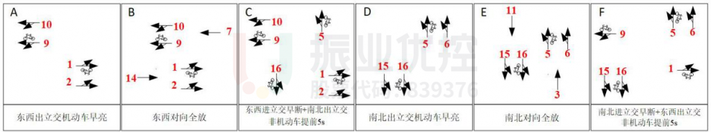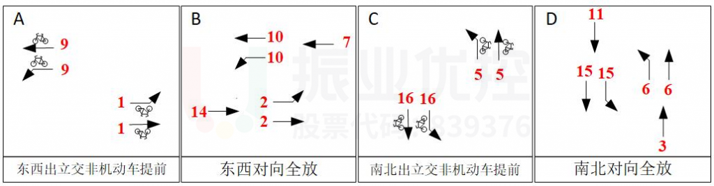 放行结构调整为“东西方向出立交机动车提前5秒-东西对向全放-东西方向进立交早断+南北出立交非机动车提前5秒-南北方向出立交机动车提前5秒-南北对向全放-南北方向进立交早断+东西出立交非机动车提前5秒。”