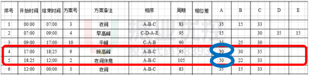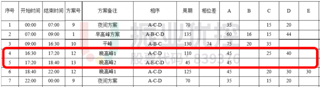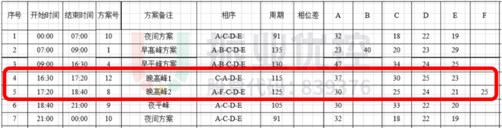根据路口不同时段流量,精细化设计晚高峰方案。晚高峰时段,根据附近车流通行需求的变化情况,对时段进行分割。分别在16:30-17:20、17:20-18:40各设一套方案,以应对需求的变化。
