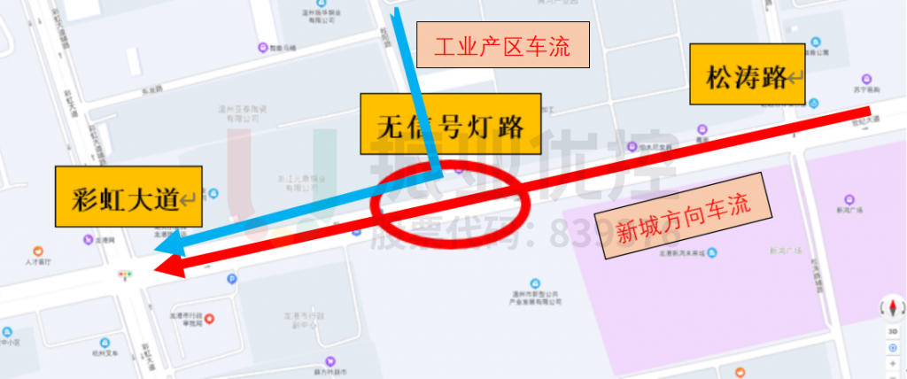 世纪大道与彩虹大道、龙翔路交汇而成的两个路口相邻且距离较近,为400米。其中,世纪大道-彩虹大道北至平阳县重要通道车站大道、南连高速路口通道,是龙港市主要交通要点;而世纪大道-龙翔路北进口目前正施工中,南进口的车道功能与车辆容纳能力均受到一定程度影响。