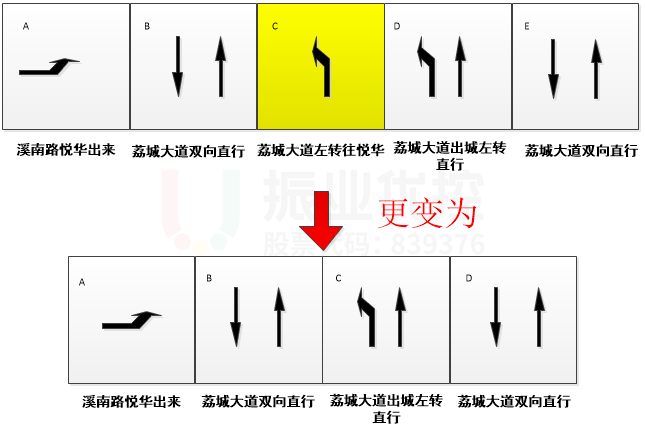 溪南路口取消靠北侧(博物馆)的斑马线,行人前往桥下绕行过街;进城方向车道停止线前移,并增设电摩待行区。