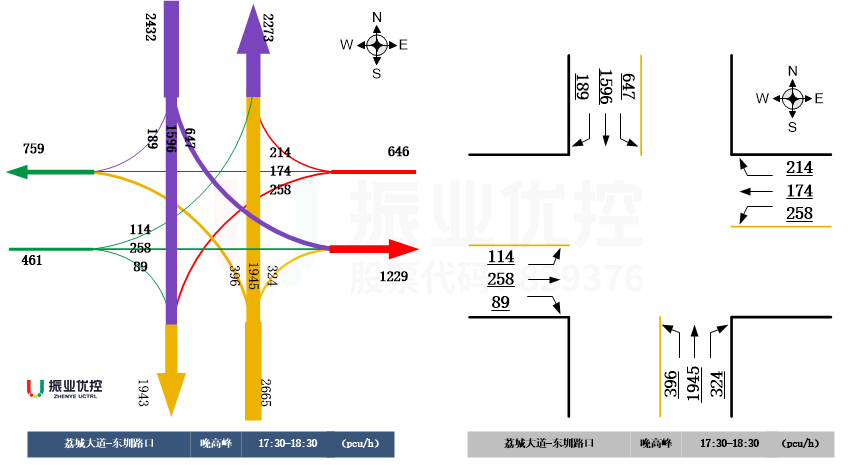 以检察院路口为例,从该路口高峰小时流量图及目前的配时方案可知,晚高峰时段南北为主流向,目前该路口属于超饱和路口。