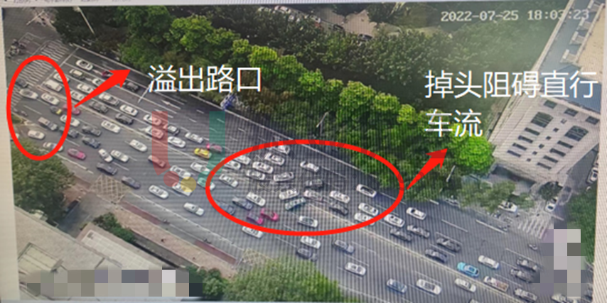 (2)检察院路口(市政府往检察院方向)通行效率低、排队较长、容易溢出到市政府路口;另外掉头车流阻碍直行车流,影响行车效率。