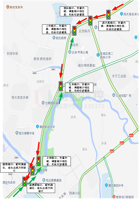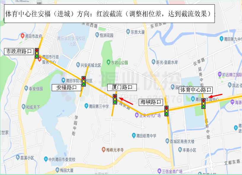 (2)荔城大道路段进城方向(西天尾往检察院)实施红波截流, 减少下郑路口往检察院方向的车流量。