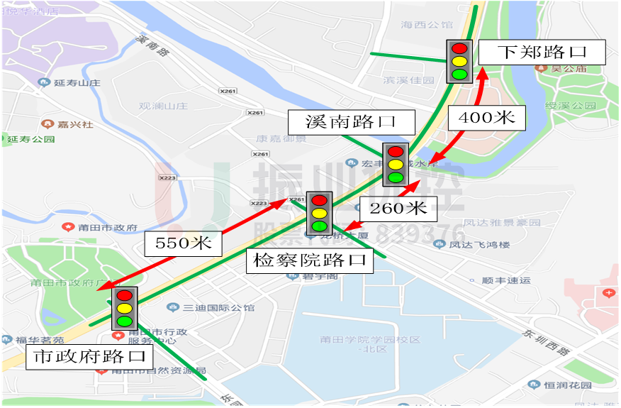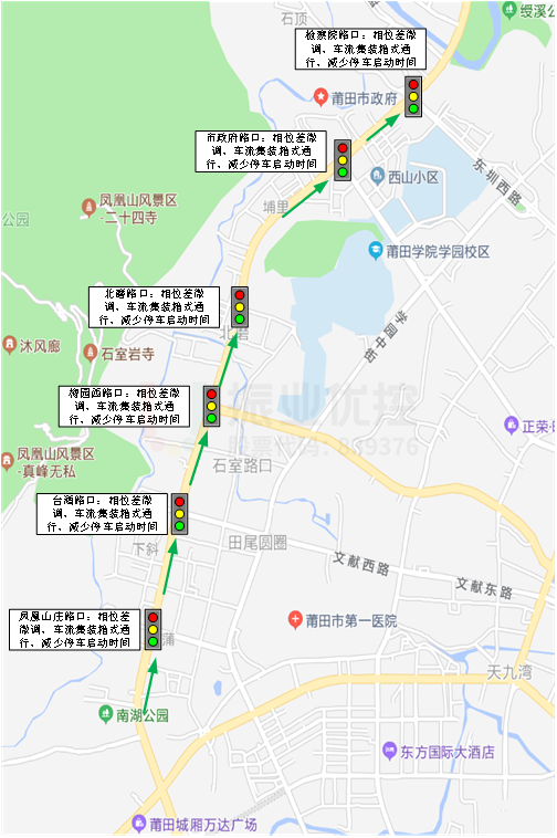 按照“缓进快出”原则均衡控制车流,一方面控制进入检察院路口车流量,将车流平均分布在荔城大道各个路口;另一方面快速清空检察院路口南向北出城车辆,提高通行效率,减少城区交通压力。如下图所示:
