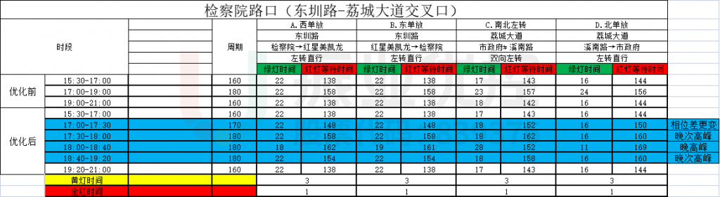 (1)根据晚高峰时段车流量数据,将检察院路口方案精细划分为4个时段方案(高峰、次高峰),有效提高路口的通行效率。