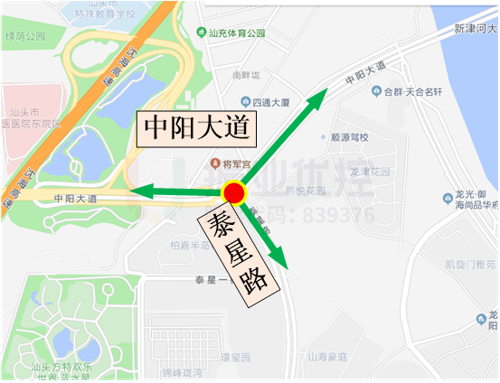 中阳泰星路口是汕头城区前往东海岸片区、澄海区、南澳岛等片区的重要节点路口。中阳大道主线西联中泰立交桥引道,主线两侧辅道与泰星路T字型平交,形成一条U型通道。