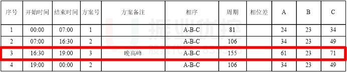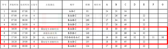 在不增加路口信号周期的情况下,调整路口相序,西单放放行时,东直行同步放行,同时考虑南左转所需的消散时间长,因此设置西单放相位清空南左转未消散车辆;并根据高峰车流特性,细致划分多个高峰方案,具体方案如下: