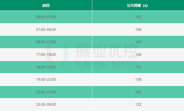 以西门路口为重要节点路口,根据西门路口方案周期及路段流量情况,确定此路段绿波协调的公共周期及时段表,如下表所示: