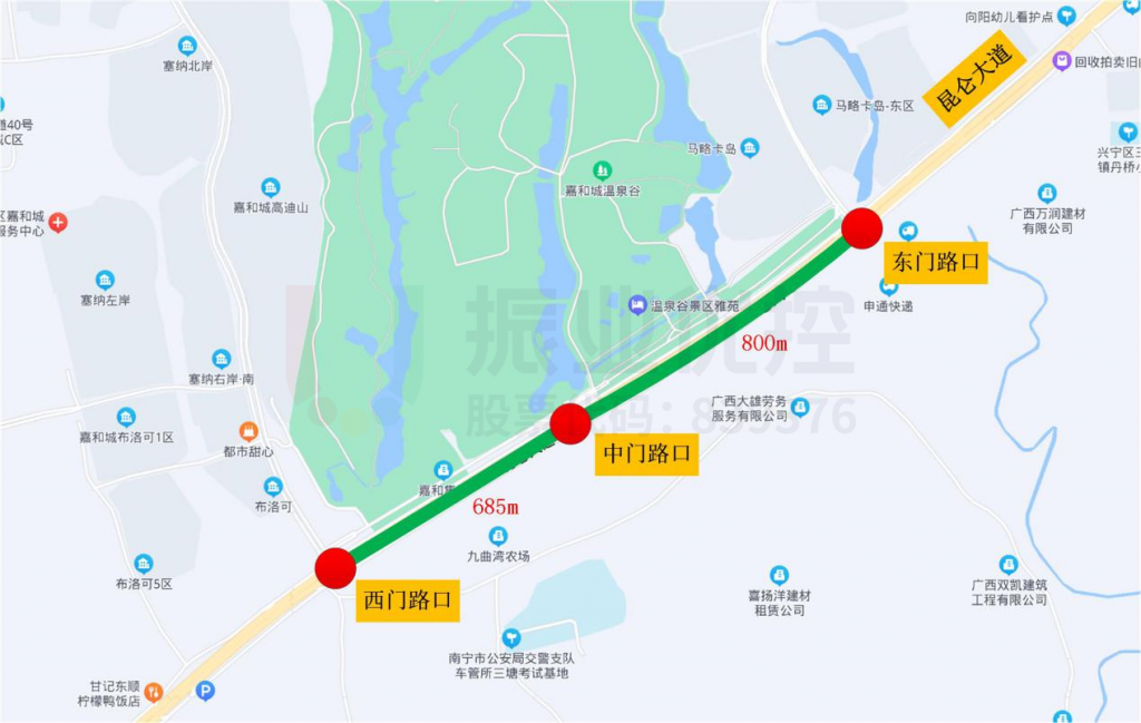 昆仑大道-嘉和城西门、中门、东门路口均为昆仑大道进出嘉和城温泉谷小区的T型路口,其中,西门路口是该小区居民出行的重要节点路口之一,晚高峰时段,车流量大,拥堵问题较为严重。