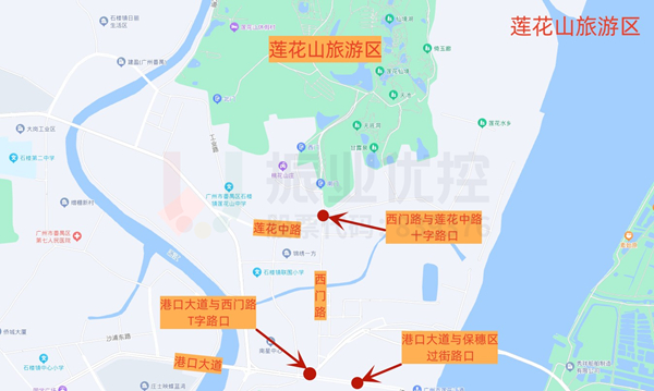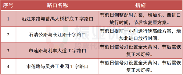 根据往年辖区交通出行规律,春节假期前后一周会呈现明显的节前出城返乡、节后进城返城交通流特征。针对此交通流特征,对进出城区主干道沿江东路与番禺大桥桥底路口、石清公路与长江路路口、市莲路与利丰大道路口、市莲路与灵兴工业园路口等4个重要节点路口设置节假日前后交通预案。