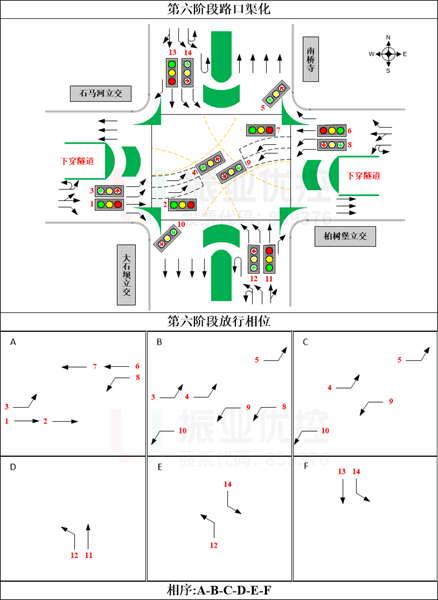 优化措施:利用已经改造后的路口空间结构,结合目前的施工组织调整,精细化信号配置,提升路口通行效率。【流向调整:途径路口各方向的车流均需通过右转前往远端掉头完成绕行。】