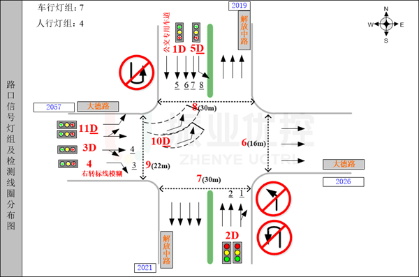 该交叉口前期已根据交通运行情况进行交通组织优化,东西向大德路路段设置西往东单行,西进口设有左转待行区,南进口禁止左转、掉头,北进口禁止掉头。