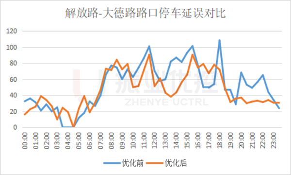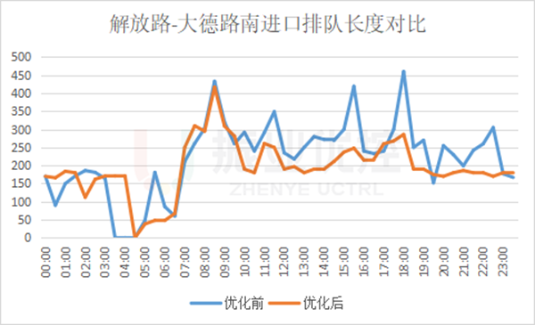 优化后,南进口排队情况明显好转,晚高峰南往北方向拥堵缓解,最大排队长度由460米下降到286米,优化率达37.8%;停车延误由108.5秒下降到71.94秒,优化率达33.7%。