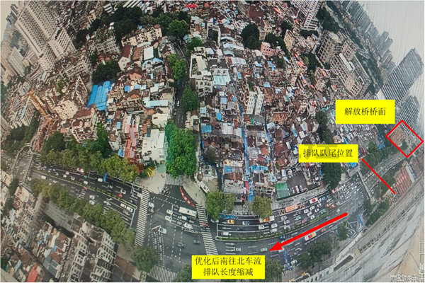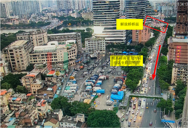 交叉口南侧上游为解放大桥,日常车辆通行需求大,晚高峰时期车流甚至排队至解放大桥桥面。