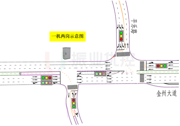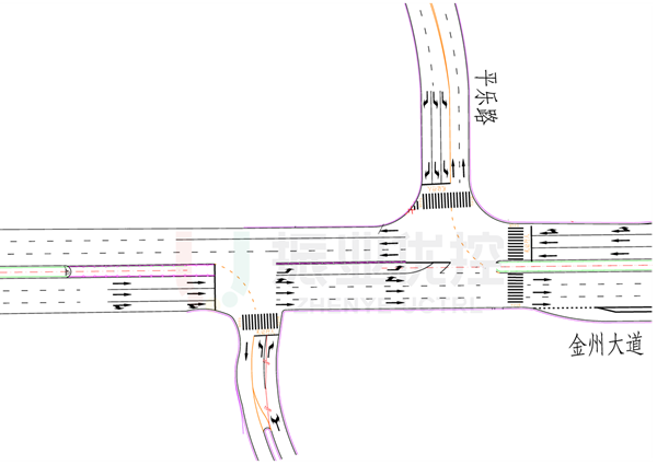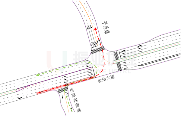 一是打开金州大道-肖家沟南路路口左转流向,满足肖家沟南路左转出行需求,减少车辆交织影响;二是调整车道功能,取消左转右置并禁止在金州大道-平乐路路口处掉头,提高左转通行效率。