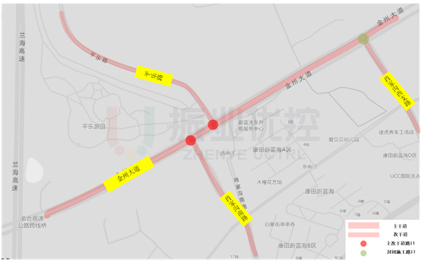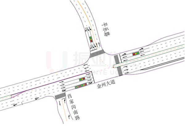 其中,金州大道-平乐路、金州大道-肖家沟南路两路口间距仅50米且受限于交通组织,高峰通勤时期两路口常由于通行能力过低出现拥堵、回溢等问题。