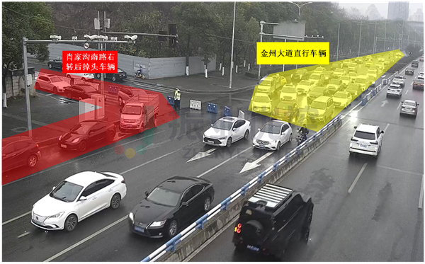 金州大道-平乐路西进口最右侧设置为掉头与左转右置混合车道,高峰期间,金州大道左转与肖家沟南路左转车流量叠加,加剧最右侧车道拥堵情况的同时,严重影响直行车辆通行。