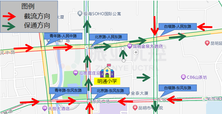 针对该学校特殊的地理位置,配时中心结合学生上学时间,提前预测堵点,制定出“远端截流+近端疏散”的保障方案。以学校为中心,保障北京路-人民东路、北京路-东风东路两个路口南北向,白塔路-人民东路东西向的顺畅通行,对青年路、白塔路汇流方向进行截流。