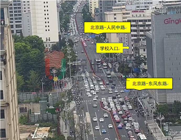以明通小学为例,其位于主城区一环北京路与人民中路两条主干线交汇处。北京路、人民路沿线车流量分别约为2400pcu/h、2000pcu/h,叠加开学大量车流,极易引发区域性拥堵。