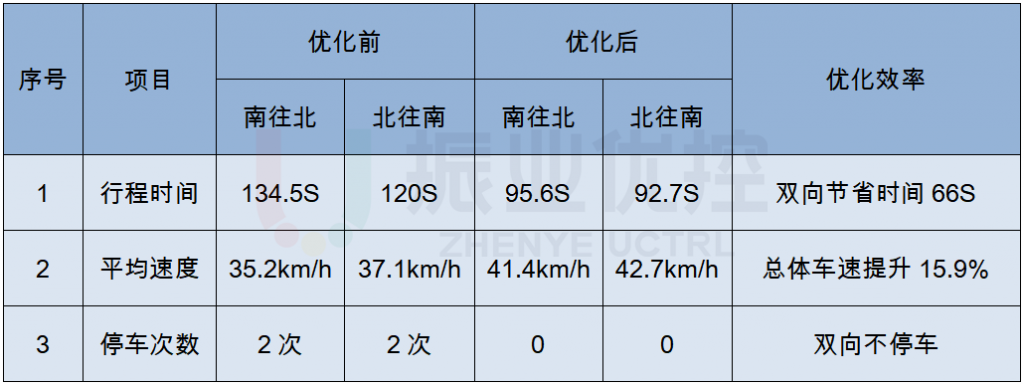 高峰期间,路段双向行程时间由254s减少至188s,平均速度由36km/h提高到42km/h。