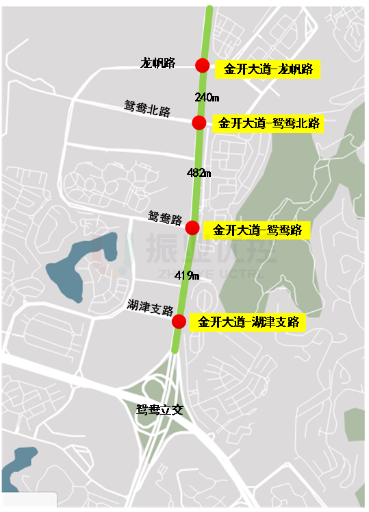 该路段全长1.1km,双向6车道,沿线分布金开大道-湖津支路、金开大道-鸳鸯路、金开大道-鸳鸯北路、金开大道-龙帆路4个信控路口,并均已实现联网控制。