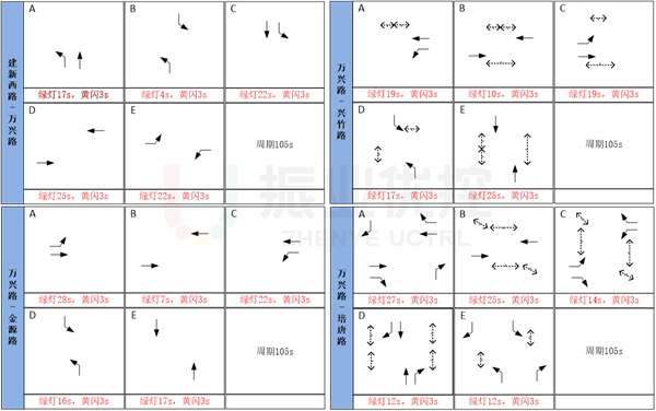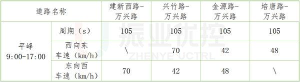 4.设计双向绿波协调方案。平峰时段(9:00-17:00),对万兴路(培唐路-建新西路)实施双向“变速”绿波协调控制。协调路段上下行绿波带宽均为20秒。