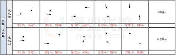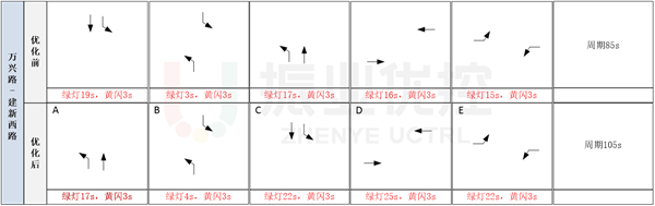 2.统一路口周期。根据协调控制需求及各路口运行情况,统一各路口周期为105s。