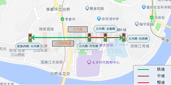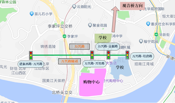 万兴路位于重庆市江北区,全长约2.2公里,东向连接华福路,西向连接建新西路,是渝澳片区东西走向的主要通道。周边分布有居民小区、学校、酒店、购物中心等交通吸引点,日常交通通行需求较大。